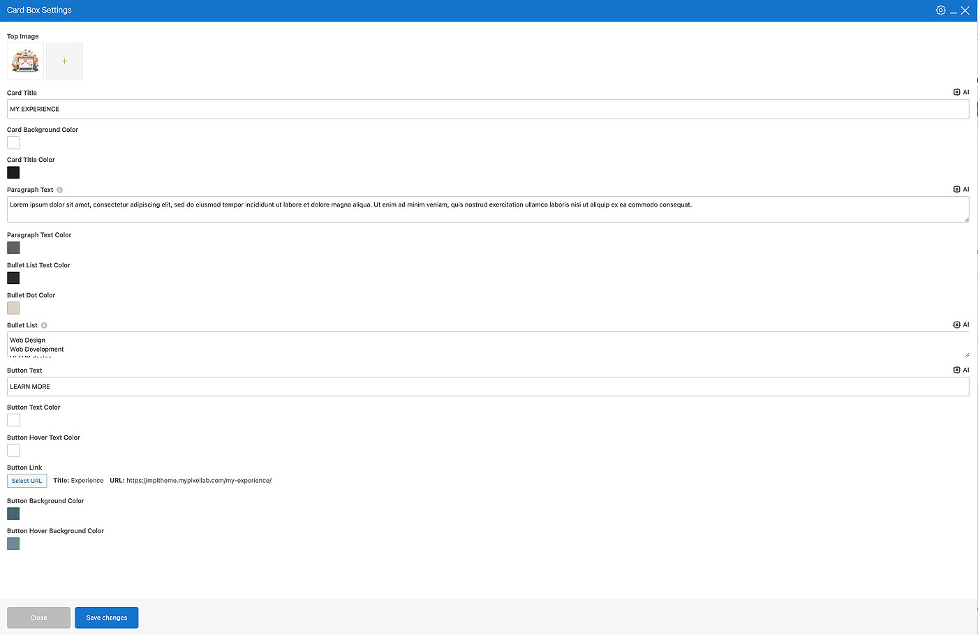 Description: A flexible content box with a top image, followed by a title, list items, and an optional button. Great for service descriptions, pricing plans, or team member profiles.
