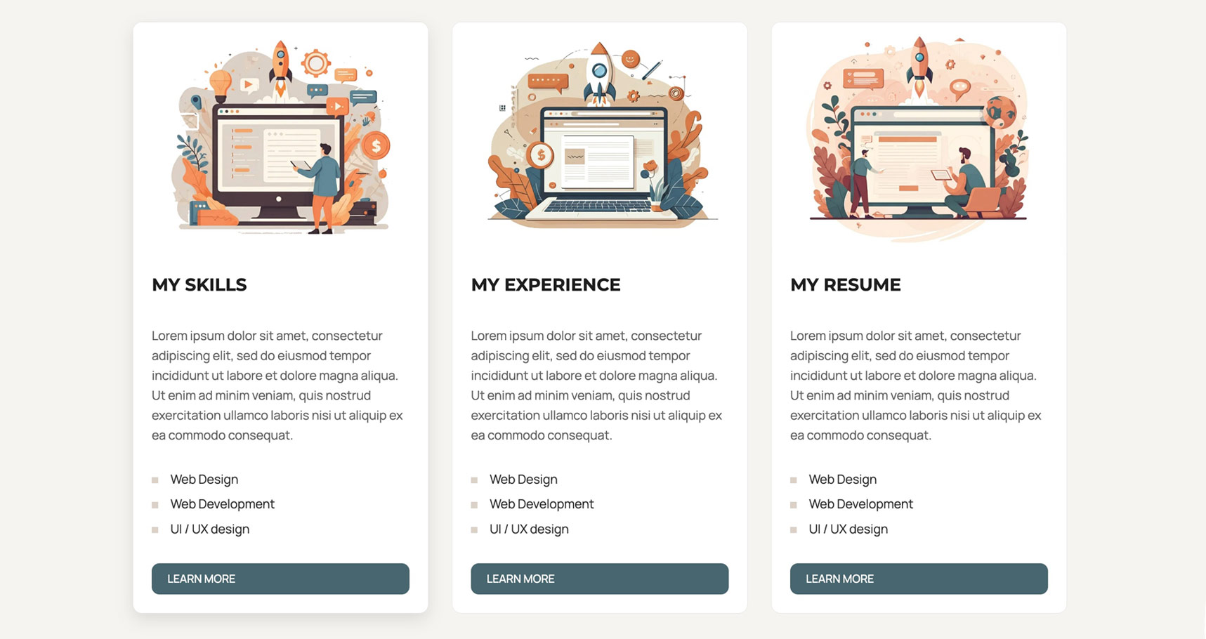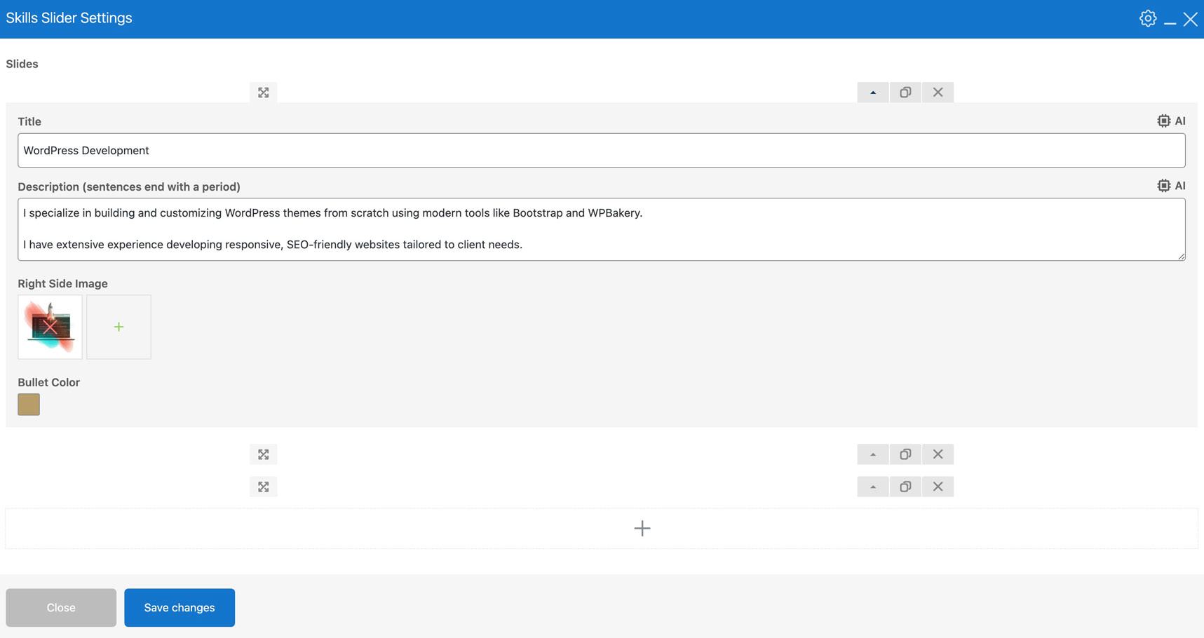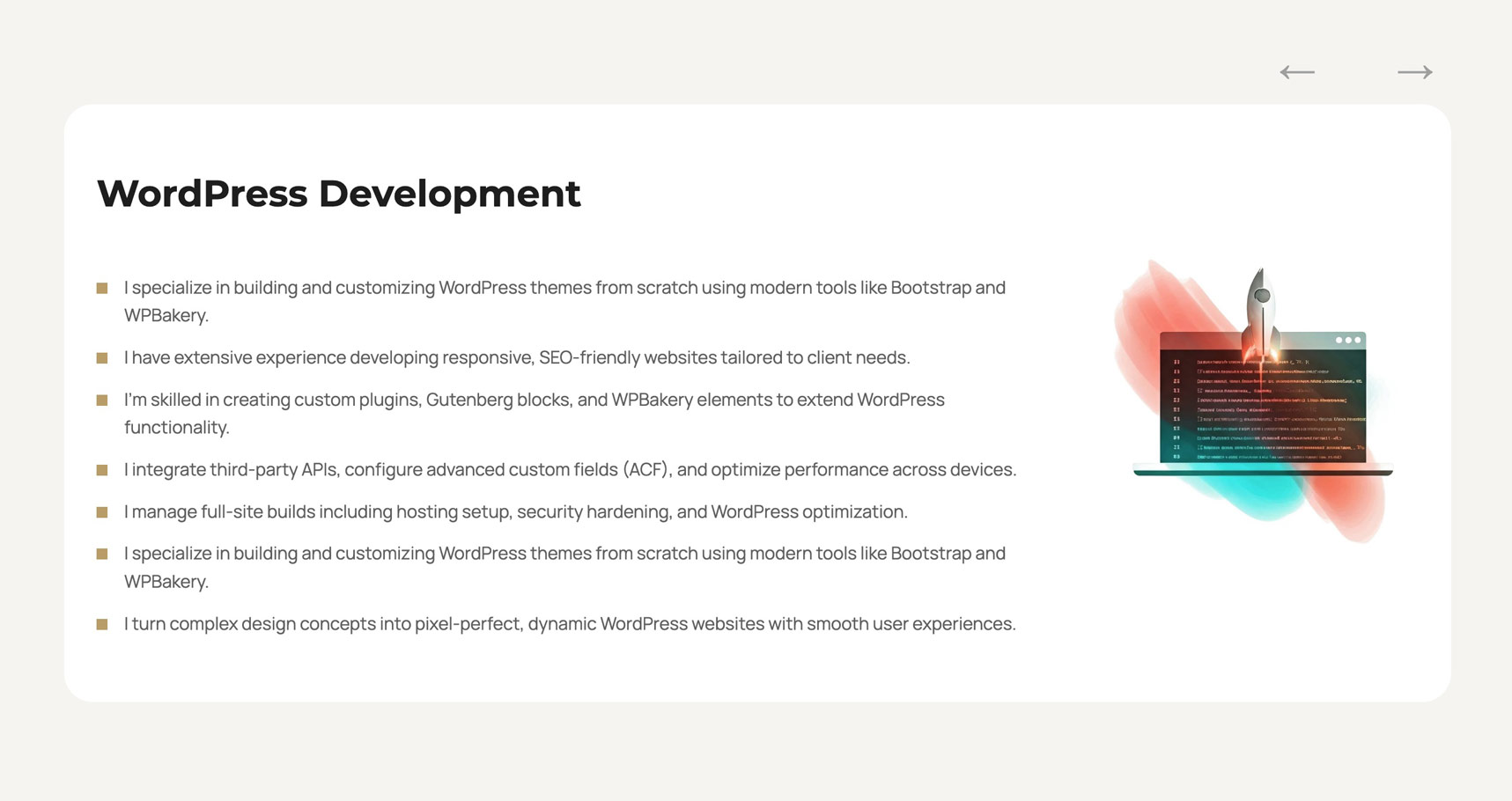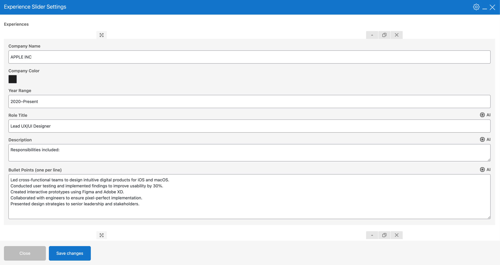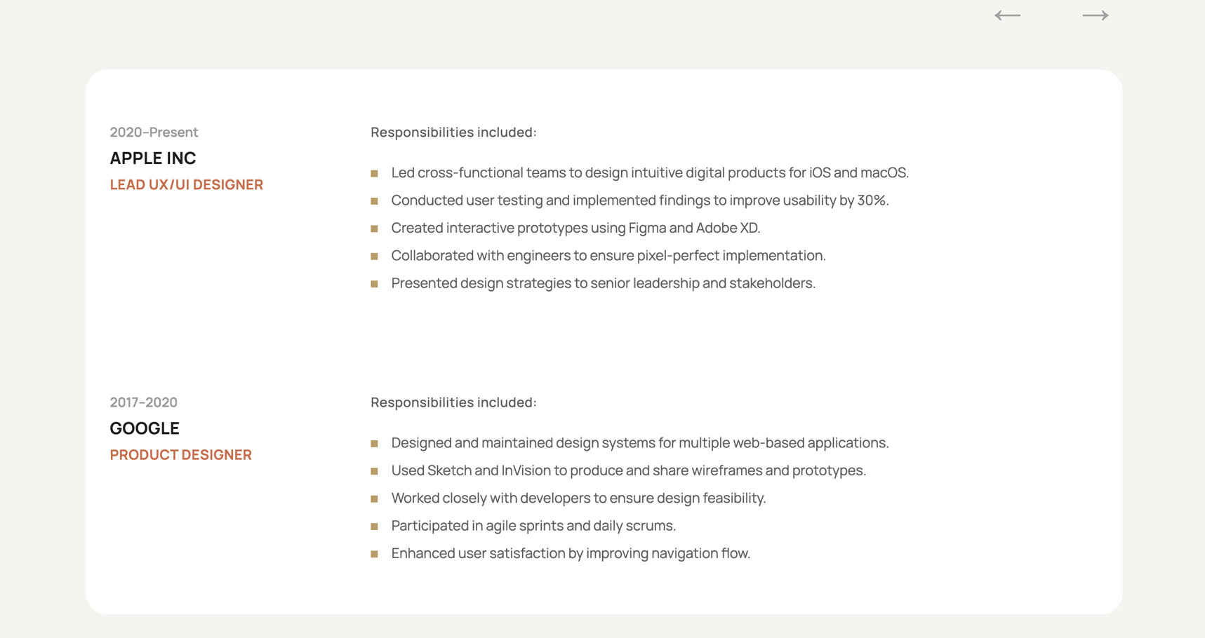 Description: A slider displaying 3 experiences (e.g., company name, role, description) per view, with arrows for navigation. Designed for work history or testimonial timelines.