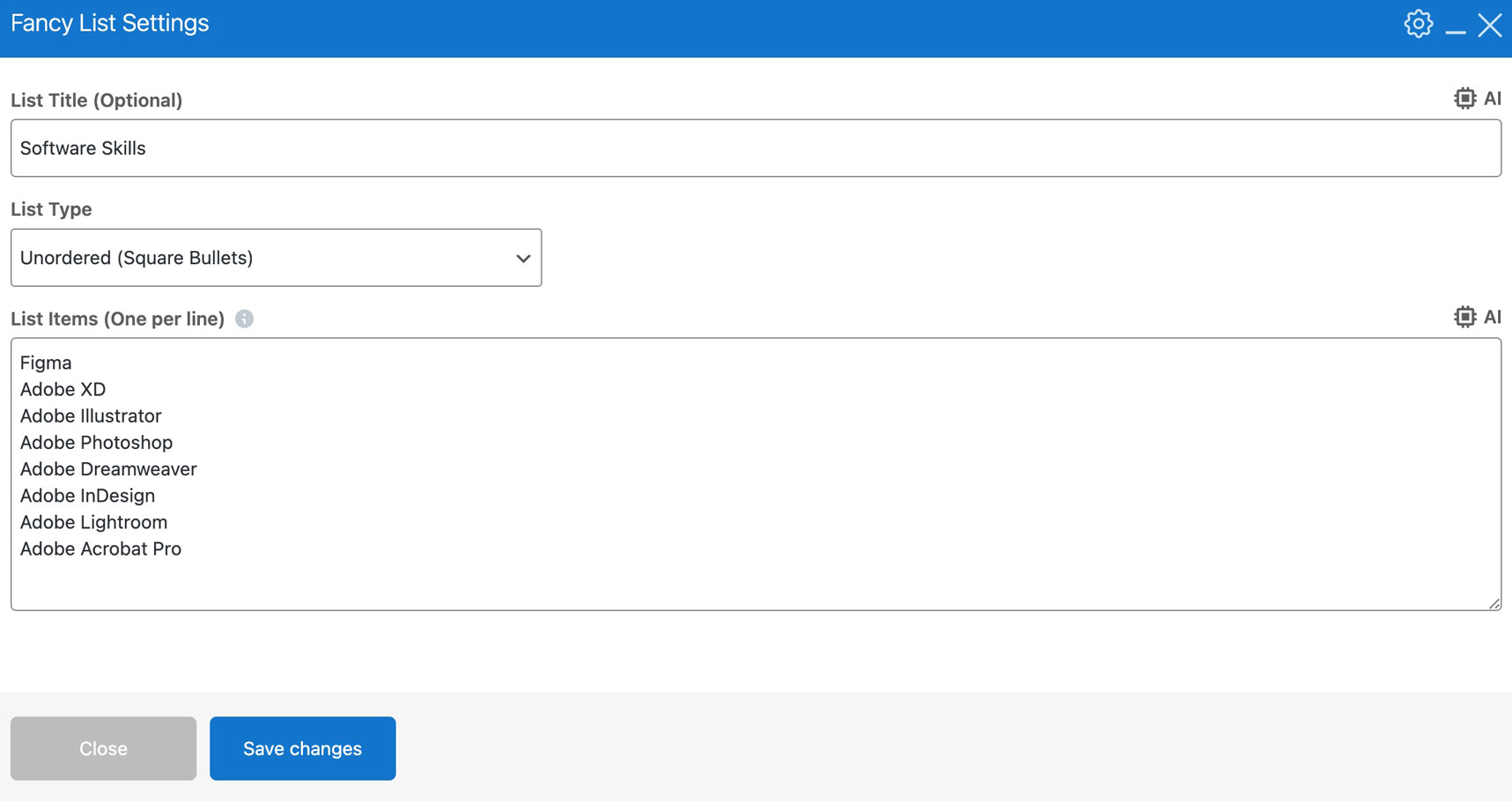 Description: A stylized list block for ordered or unordered content, with optional title. Useful for highlighting features, steps, or key points with custom icons and layout.