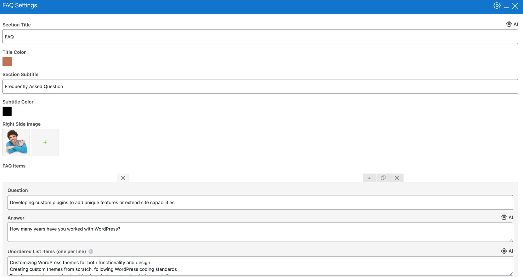 Description: A clean and modern accordion-style Frequently Asked Questions block. Includes color and image options to customize section visuals and layout