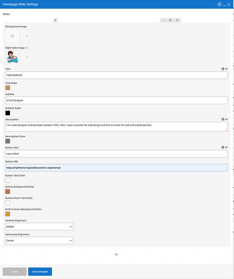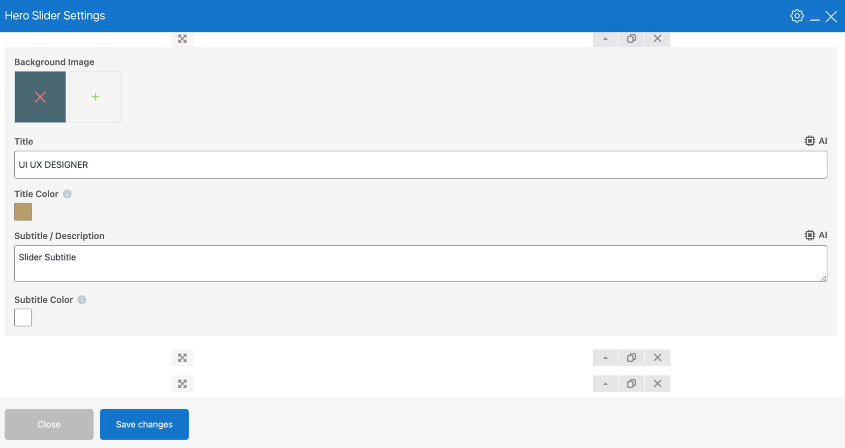Description: A fullscreen Swiper slider with support for images, captions, and optional buttons. Ideal for homepage banners or section intros where you need bold visuals and text animations.