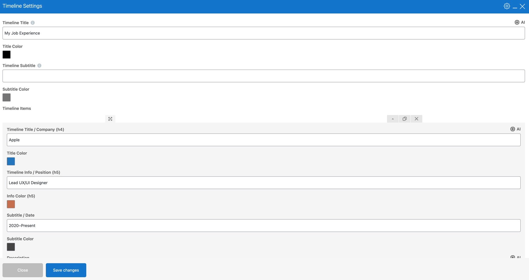Description: A vertical timeline with icons, colors, and layout controls. Perfect for resumes, project milestones, or historical storytelling in a visually engaging forma.